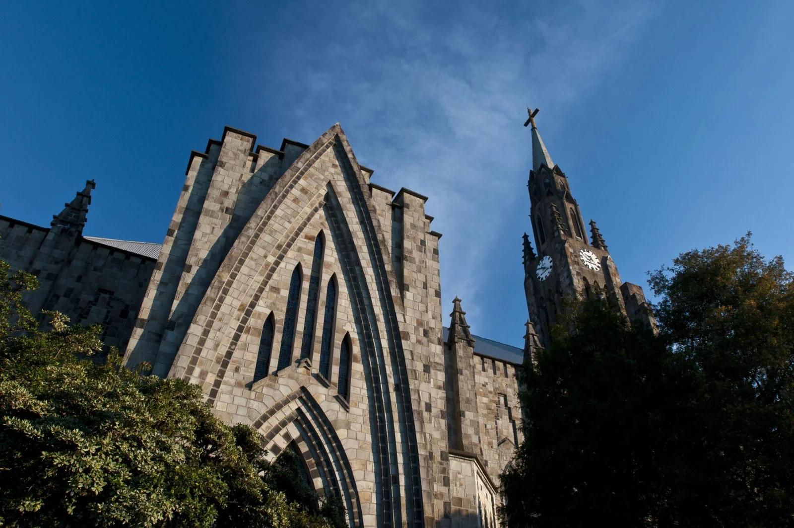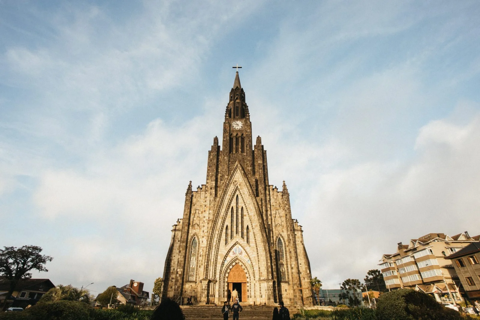 A Paróquia Nossa Senhora de Lourdes, popularmente conhecida como a Catedral de Pedra, é o ícone máximo de Canela e uma das construções religiosas mais imponentes do Brasil. Situada majestosamente no centro da cidade, o espaço flui em um estilo gótico inglês que domina a paisagem com sua torre de 65 metros de altura.